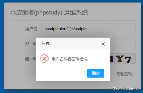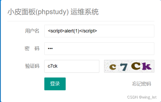 先写个js弹窗代码试试它有没有xss漏洞,密码可以随便输入,但验证码必须输入正确,不然不会把用户名记录进去