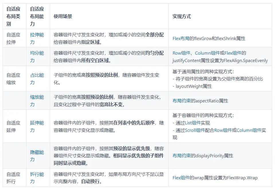 针对常见的开发场景,方舟开发框架提炼了七种自适应布局能力,这些布局可以独立使用,也可多种布局叠加使用。