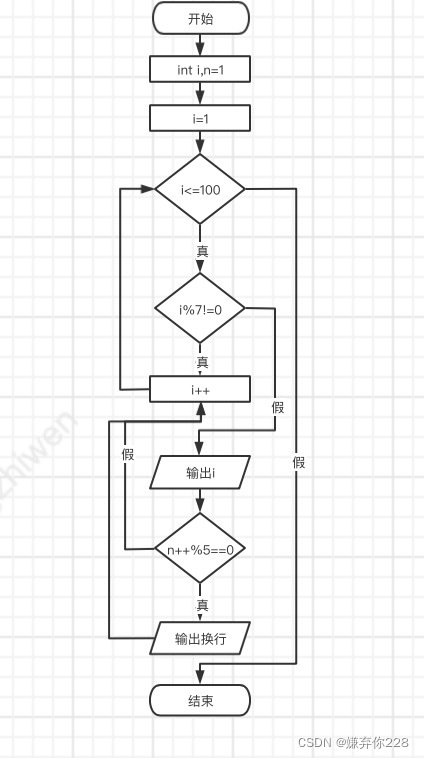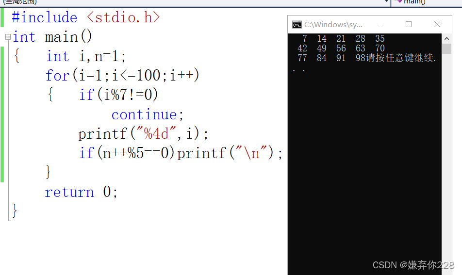 【例5.22】把1~100之间能7整除的数,以每行5个的形式在屏幕上输出
