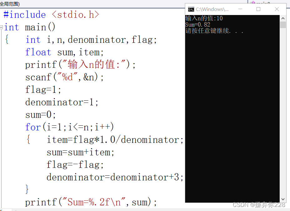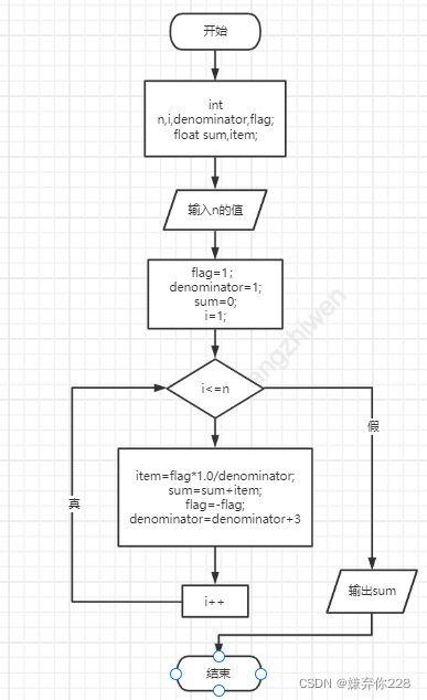 【例5.5】输入一个整数n,计算1-1/4+1/7-1/10+1/13-1/16+...的前n项之和