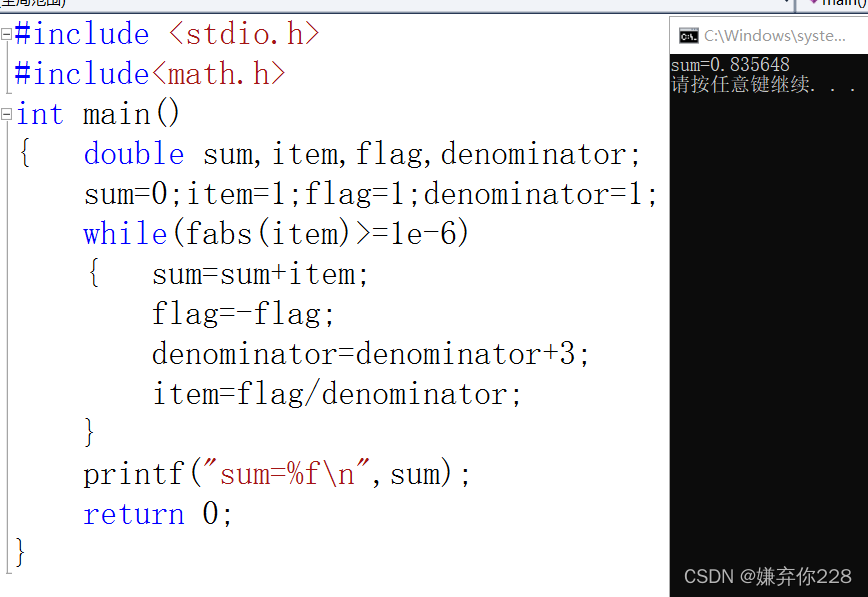 【例5.2】计算1-4/1+7/1-10/1+13/1-16/1+...的和,直到某一项的绝对值小于10负6次方