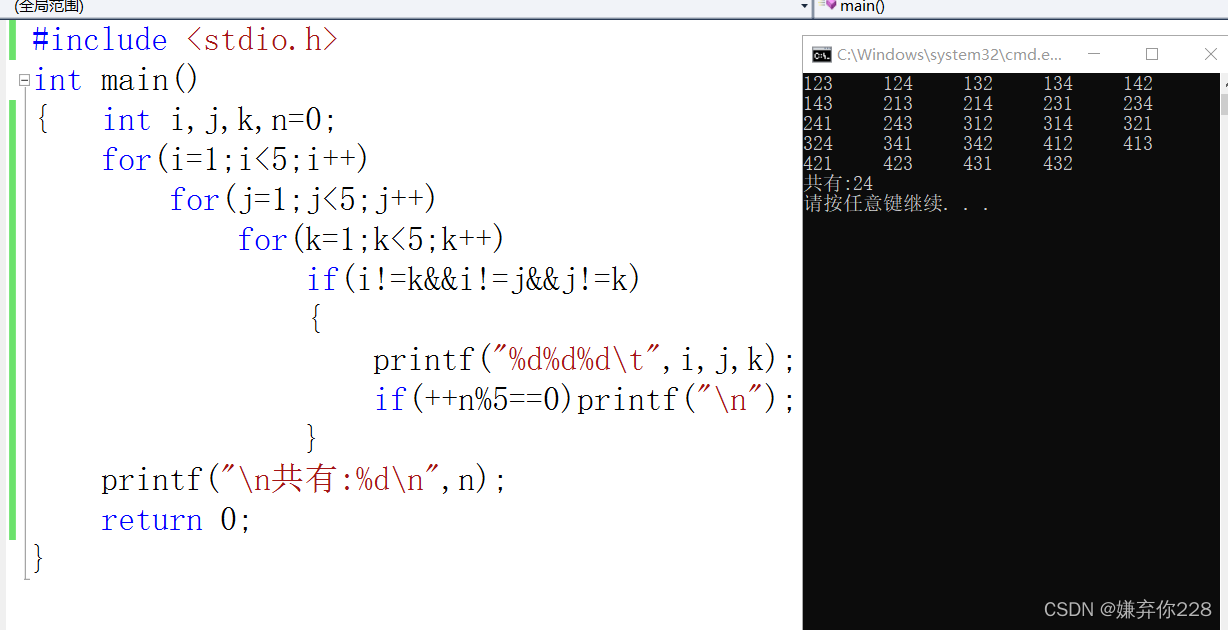 【例5.33】判断由1、2、3、4四个数字能组成多少个互不相同且无重复数字的三位数?输出这些数