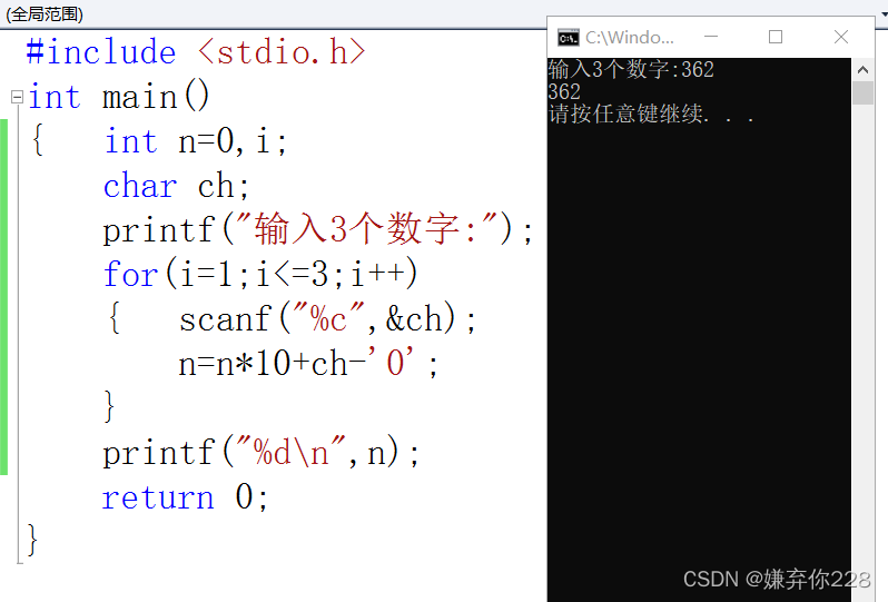 【例5.11】 由键盘输入3个数字,将其组合成一个整型数并输出