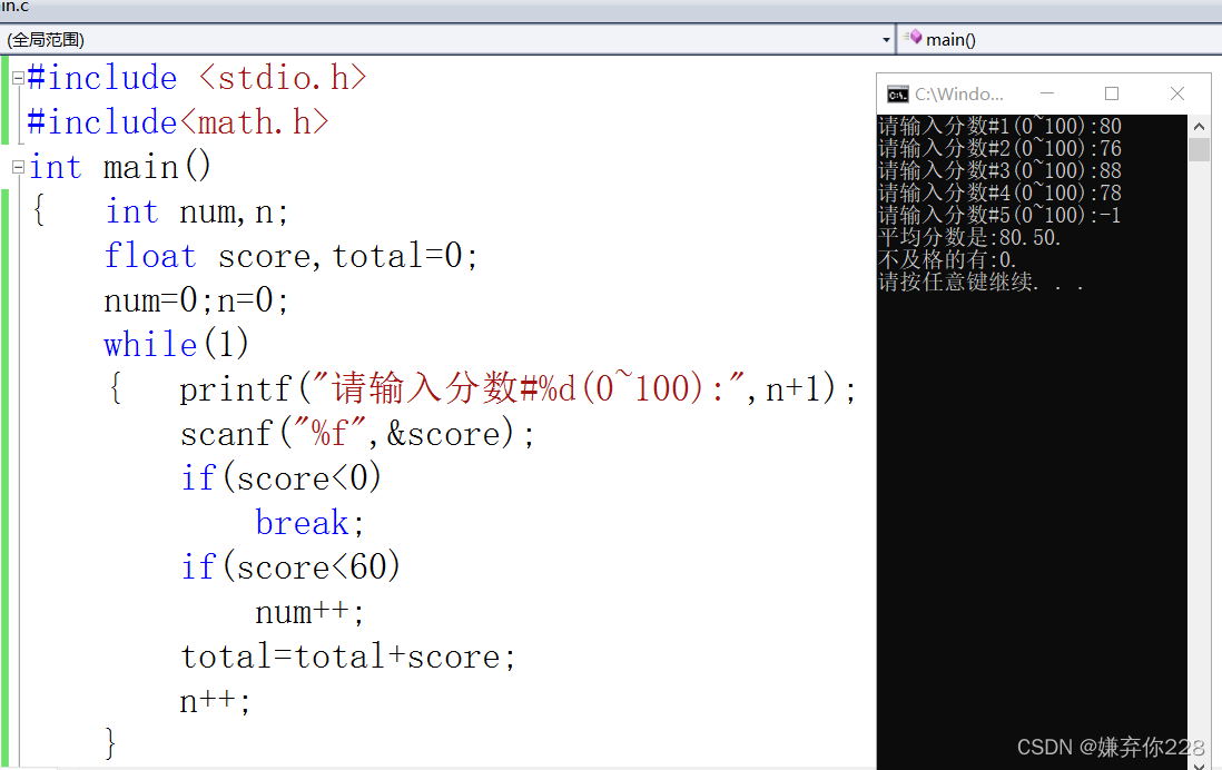 【例5.21】从键盘输入一批学生的成绩,计算平均分,并统计不及格成绩个数