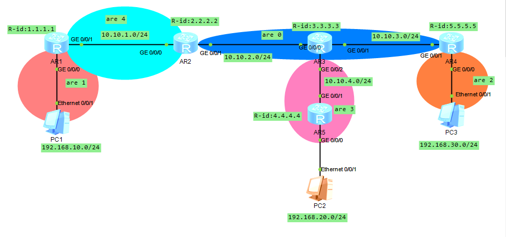 OSPF路由协议可以分为单区域和多区域,area 0(0.0.0.0)为骨干区域,是必须存在的区域。如果是多区域的OSPF,则只能存在一个骨干区域,其他区域为非骨干区域。非骨干区域必须和骨干区域相连,骨干区域不能分裂。如果出现上述情况,需要通过虚链路技术解决