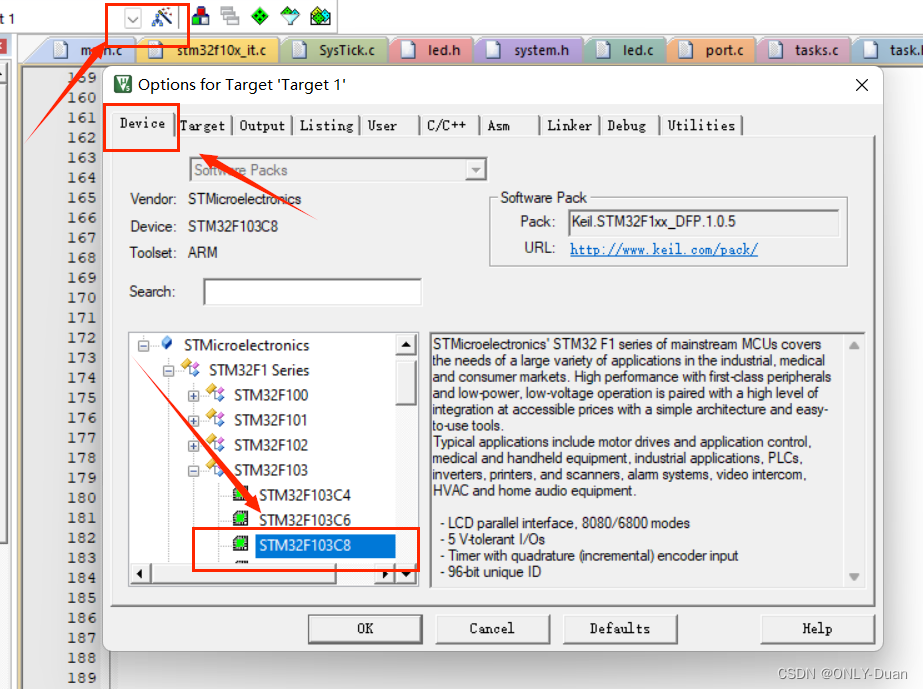 先修改芯片所需宏定义,STM32F103ZE是大容量是HD,STM32F103C8是中容量选择MD