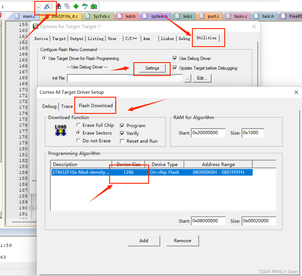 改芯片烧写算法中STM32F103C8是中容量,容量可以选择128K的即可。