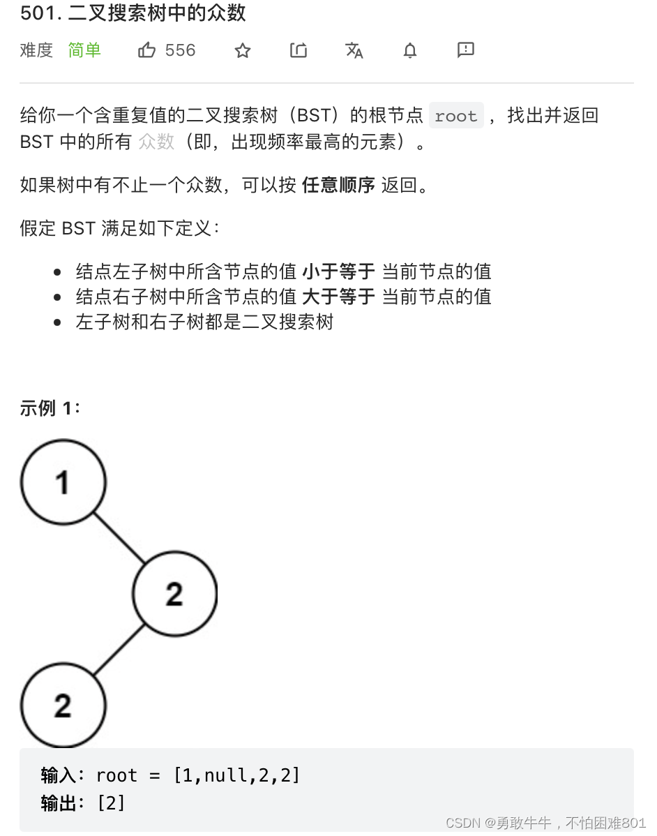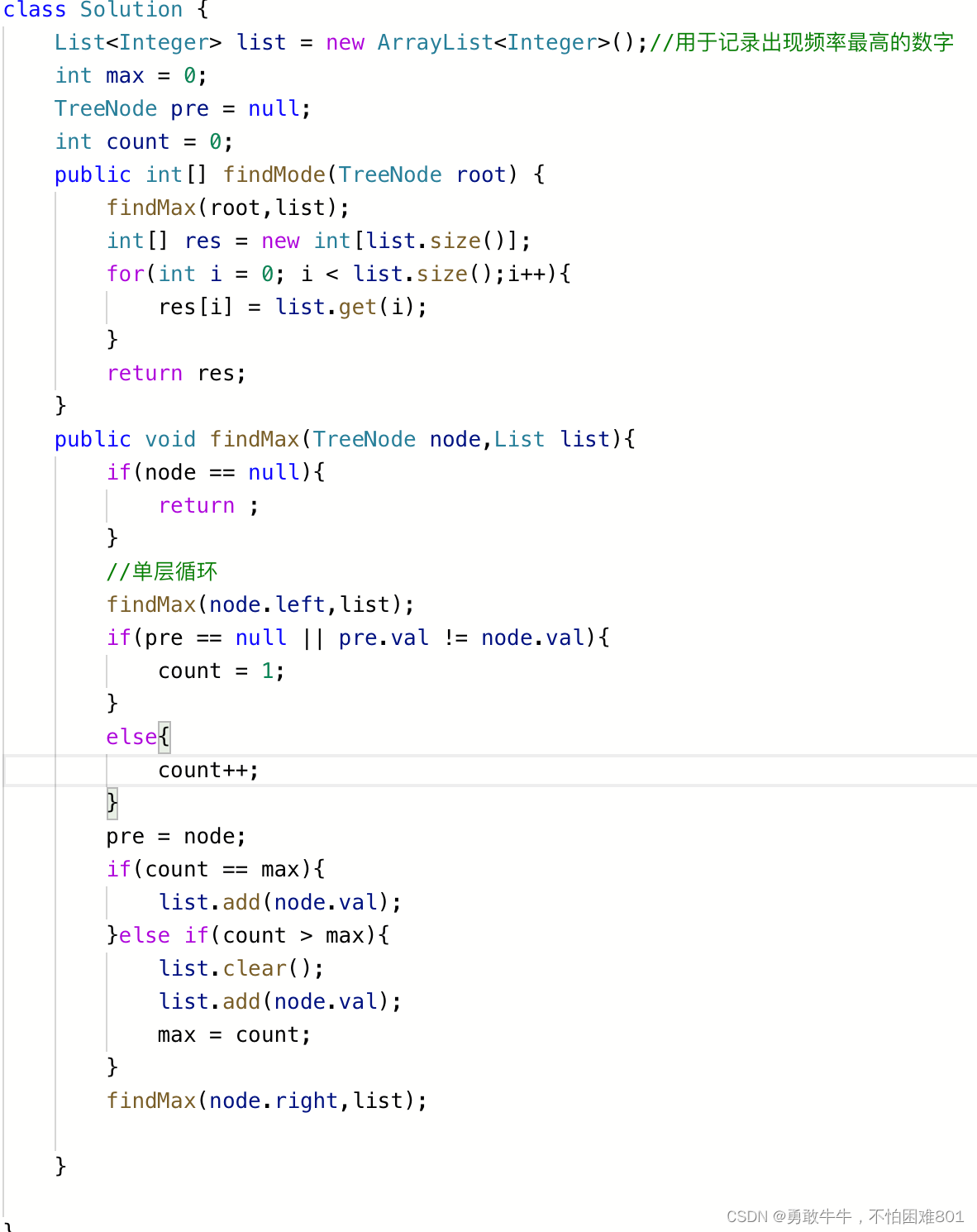- max:用来记录出现的最高频率,当当前节点出现的频率和max相等时,list集合就会记录当前节点,如果count>max时,就会清空list里面的所有节点,将当前节点记录进去。