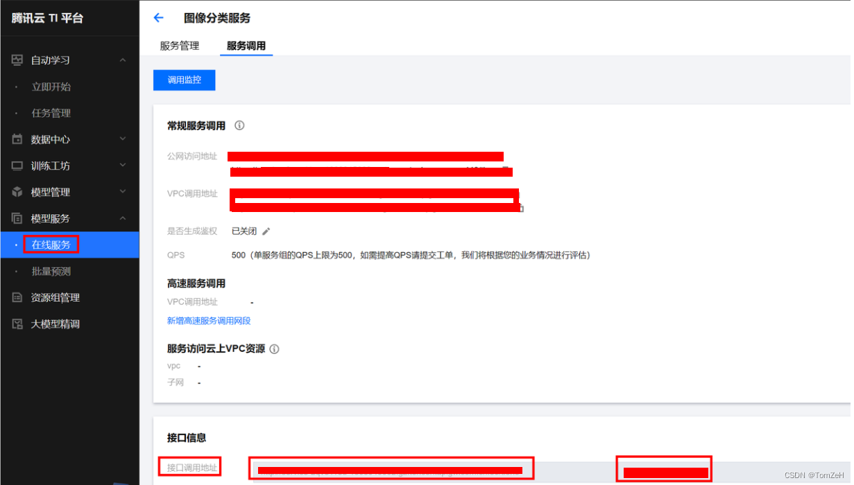 在在线服务中点击对应服务的调用,进入服务调用,注意是使用接口调用地址,前后都要