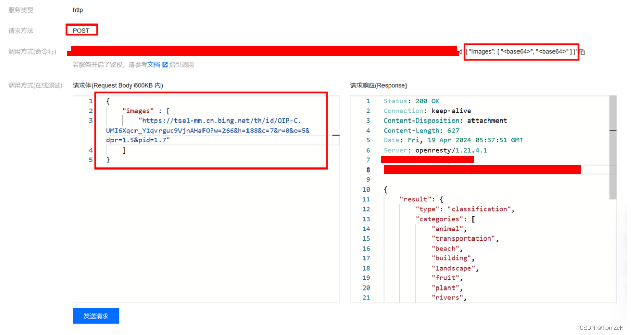 在本地发送请求时,请求体要严格按照在线测试中的请求体,请求体可见调用方式(命令行)-d后的内容