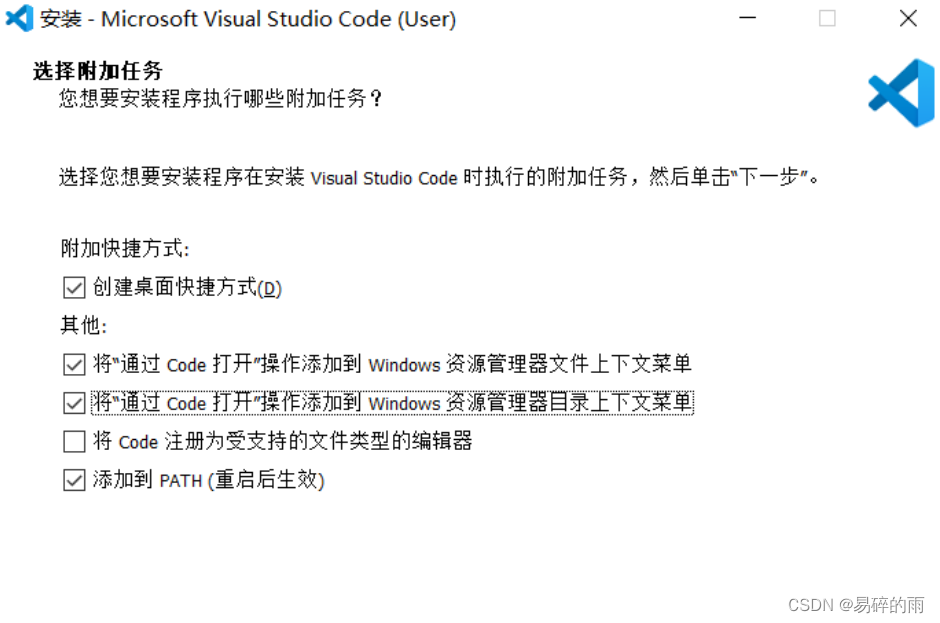 附加任务的勾选可以参考下图,“通过VScod打开”操作就是你在一个文件上点右键,弹出的有菜单会有这个选项。