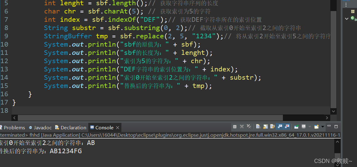 StringBuffer tmp = sbf.replace(2, 5, "1234");// 将从索引2开始至索引5之间的字符序列替换成"1234"