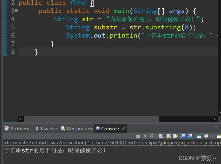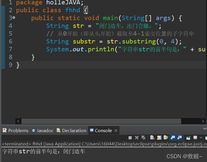 System.out.println("索引0开始至索引2之间的字符串:" + substr);