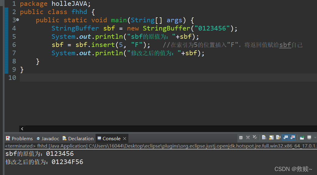 sbf = sbf.insert(5, "F"); //在索引为5的位置插入"F",将返回值赋给sbf自己