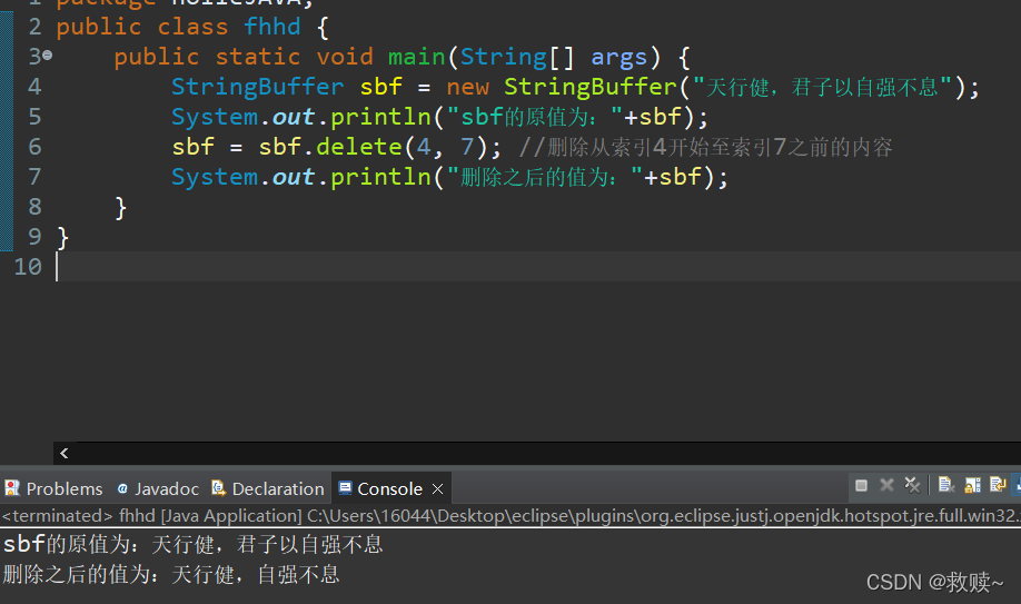 System.out.println("删除之后的值为:"+sbf);