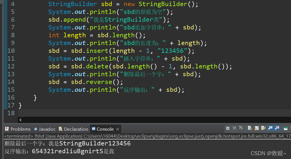 System.out.println("删除最后一个字:" + sbd);