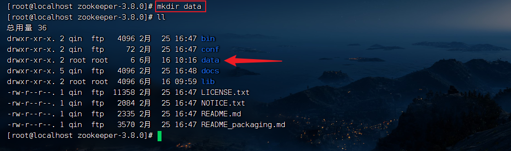 5、新建一个data目录,用来存zookeeper的数据(一会需要配置)