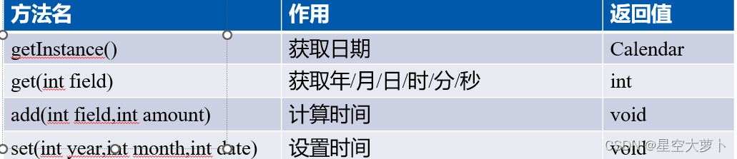 Calendar 类是一个抽象类,它为特定瞬间与一组诸如 YEAR、MONTH、DAY_OF_MONTH、HOUR 等 日历字段之间的转换提供了一些方法,并为操作日历字段(例如获得下星期的日期)提供了一些方法