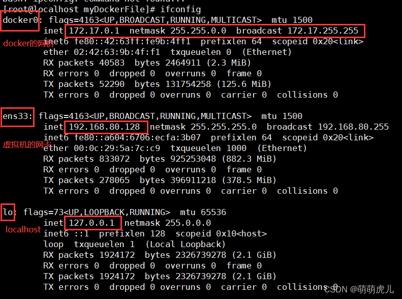 2 docker run 的时候,没有指定network的话默认使用的网络模式就是bridge,使用的就是docker0。在宿主机ifconfig,就可以看到docker0和自己create的network(后面讲):eth0,eth1,eth2……代表网卡一,网卡二,网卡三……,lo代表127.0.0.1,即localhost,inet addr用来表示网卡的IP地址