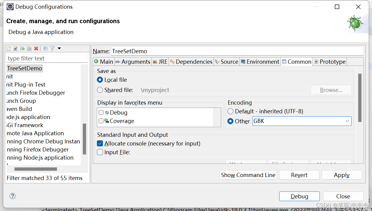 Run->Run Configurations->Common,选中other,输入GBK即可。