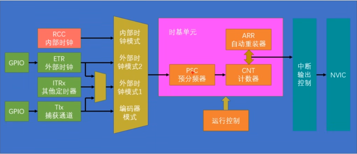 第六步:运行控制,整个模块配置完成后,还需要使能一下计数器,当定时器使能后,计数器就会开始计数了,当计数器更新时,触发中断,第三步:配置时基单元,包括预分频器、自动重装器、计数模式等,通过结构体配置。第五步:配置NVIC,在NVIC中打开定时器中断的通道,并分配一个优先级。// 获取标志位,清除标志位,前两个是CPU运行时获取,后两个为中断获取。最后再写一个中断函数,这样这个中断函数每隔一段时间就能自动执行一次了。第四步:配置中断输出控制,允许更新中断输出到NVIC。以下五个时钟源选择对应图中标志1。