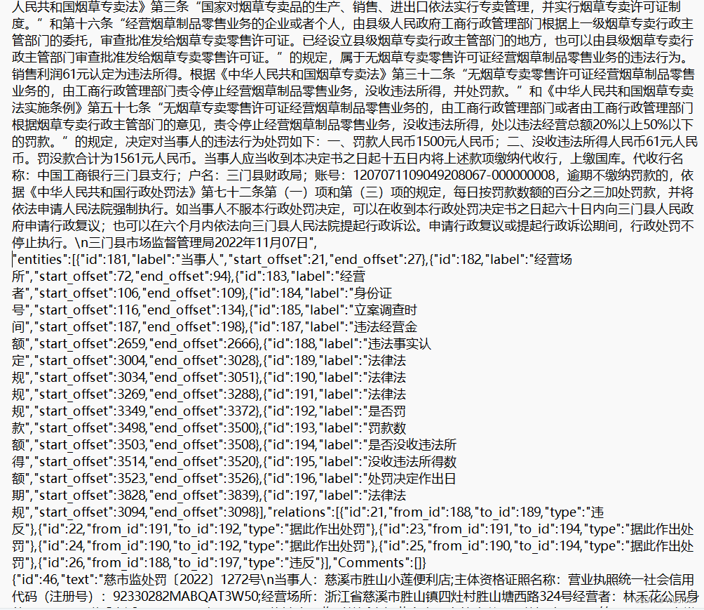 首先要建立合适的标注体系:我们将带结构的实体信息抽取过程转化为了实体关系联合抽取任务,并根据实际需要指定了单种实体多种关系的标注,使其符合CasRel的使用范围,并简化的关系体系,使用软件doccano进行了标注。