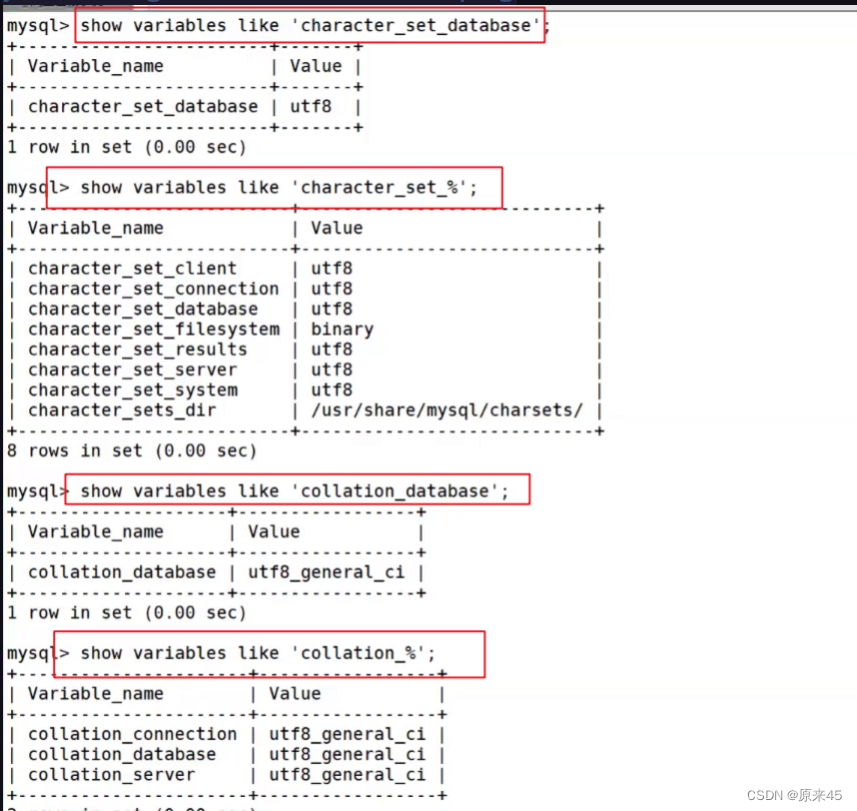 show variables like 'character_set_database' ;show variables like 'collation_database' ;variables:mysql启动之后,里面会存在很多的variables,在数据库表里面存着,mysql启动时有些常用的variables可能被load到mysql进程的上下文当中,就有点像前面的环境变量。![]()