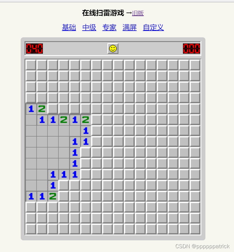 //拓展:标记雷;炸开一片:1.该坐标不是雷 2.该坐标周围八个坐标也不是雷 3.该坐标未被排查过,这个时候就会展开一片