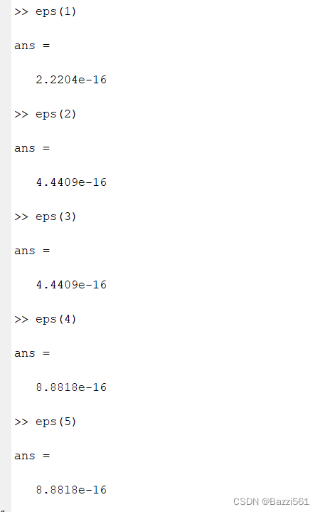 且由于尾数要表示范围的不断增大,要表示尾数占用的位数不断变大,假设表示浮点数的总位数不变,则其阶码可用尾数不断减小,由此可以看到eps(x)的大小随着x的增大而减小,或者说阶码可用位数随着x的增大而减小。模糊地讲,由于2的二进制为10,3的二进制为11都是两位,故而猜测其尾数占用的位数一致,则用于表示阶码的位数也一致,由此可知,其eps(x)函数的返回值一致。假设x为double类型,那么eps(x)返回ab(x)与x最近的浮点数的差。eps与其参数x的数值大小以及x的数据类型有关。