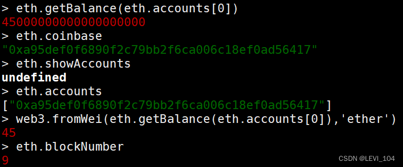 1.输入:geth --datadir . --dev console 2>ouput.log。进入到一个新的私链,里面有一个账户,有很多钱,并且它是默认解锁的。并且这个私链是自动挖矿的(即只要发起交易,就自动出块,平时不挖矿)。