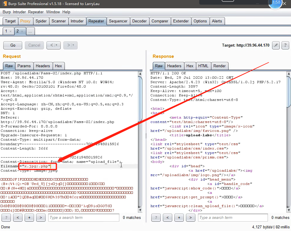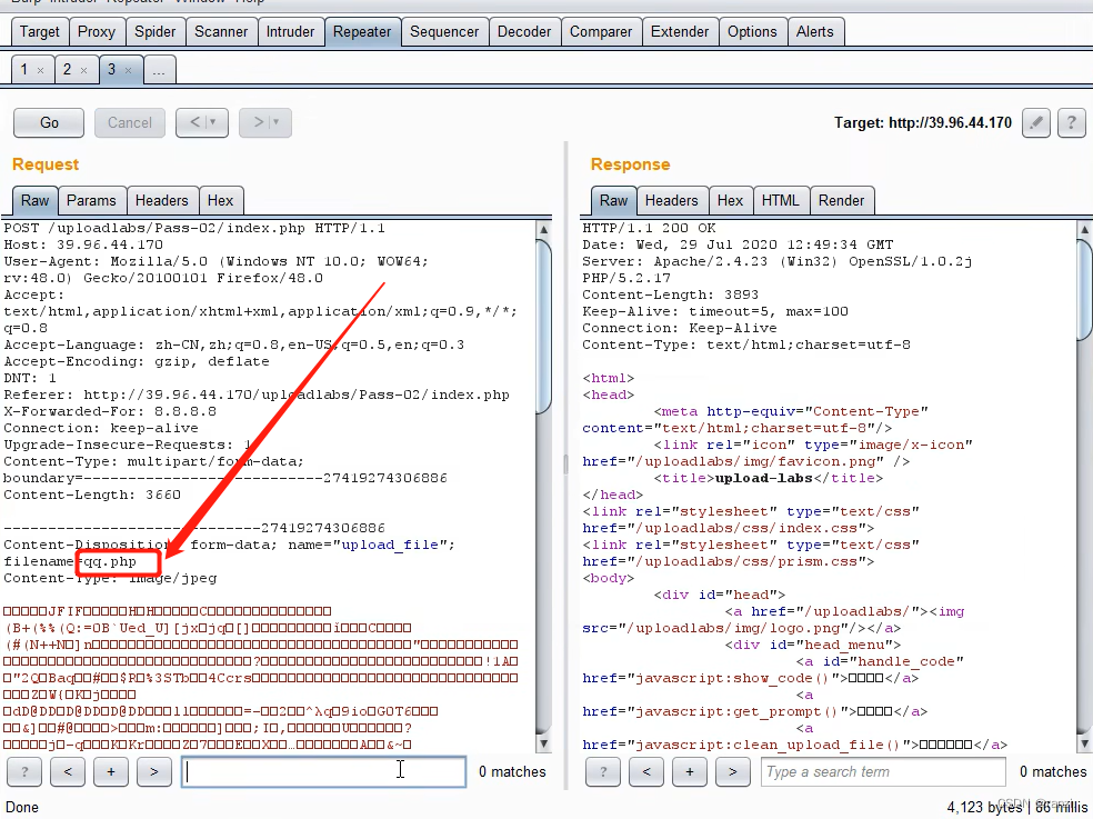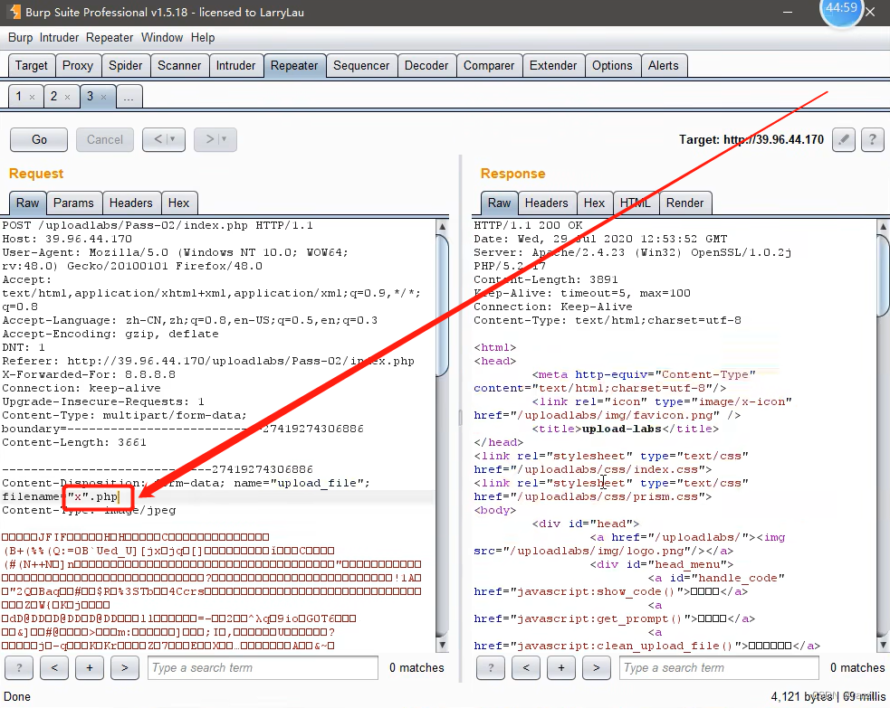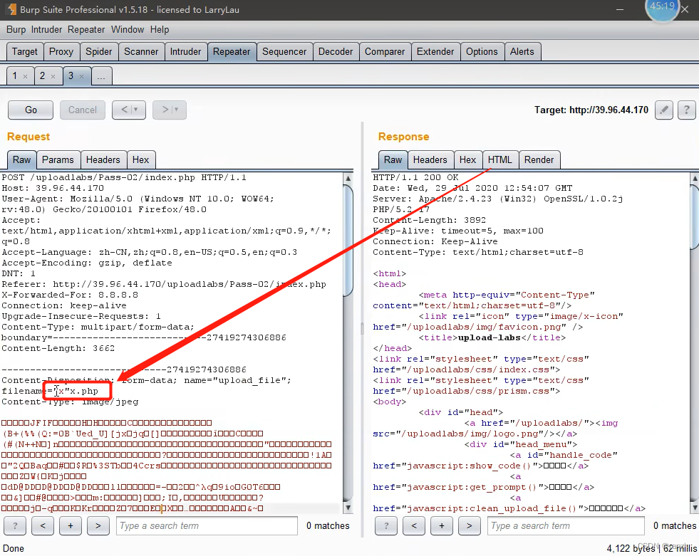 将前面的内容像如图所示一样插入到filename参数值里进行上传,发现上传成功了。