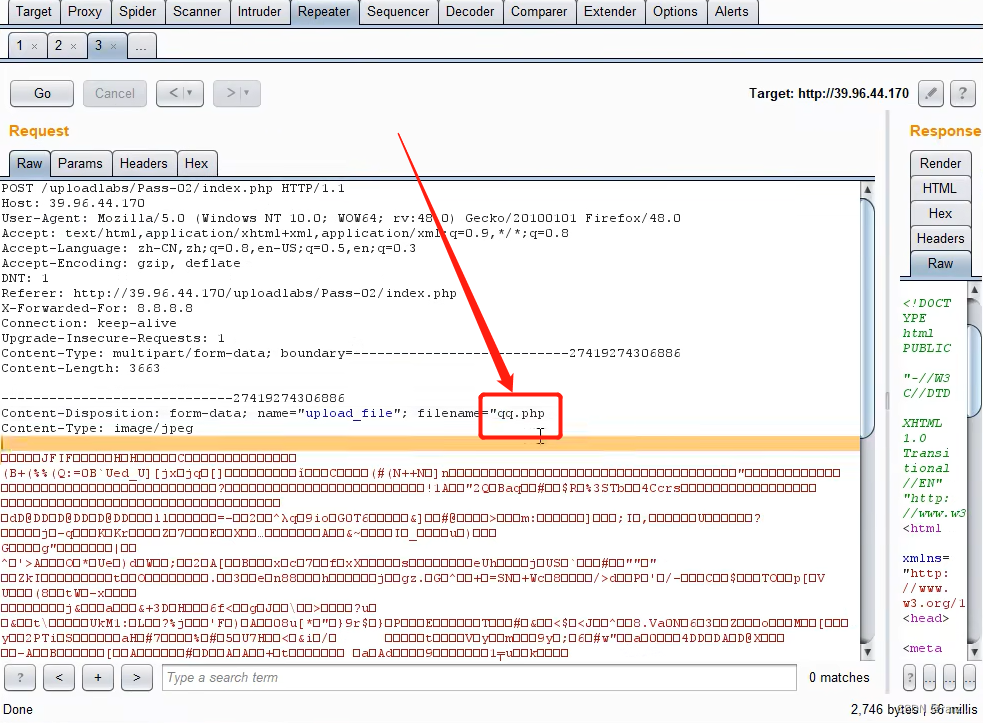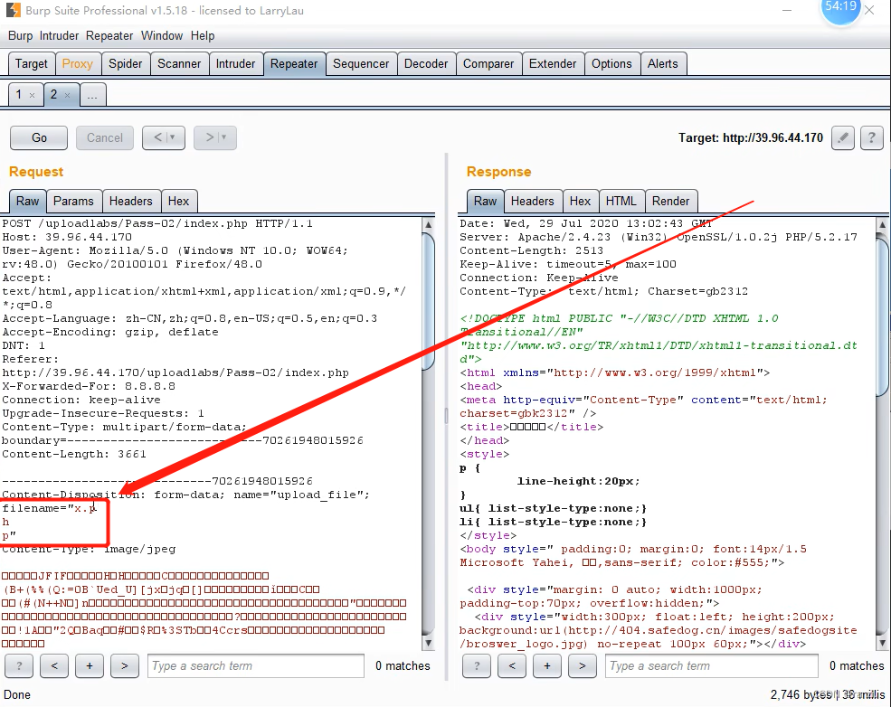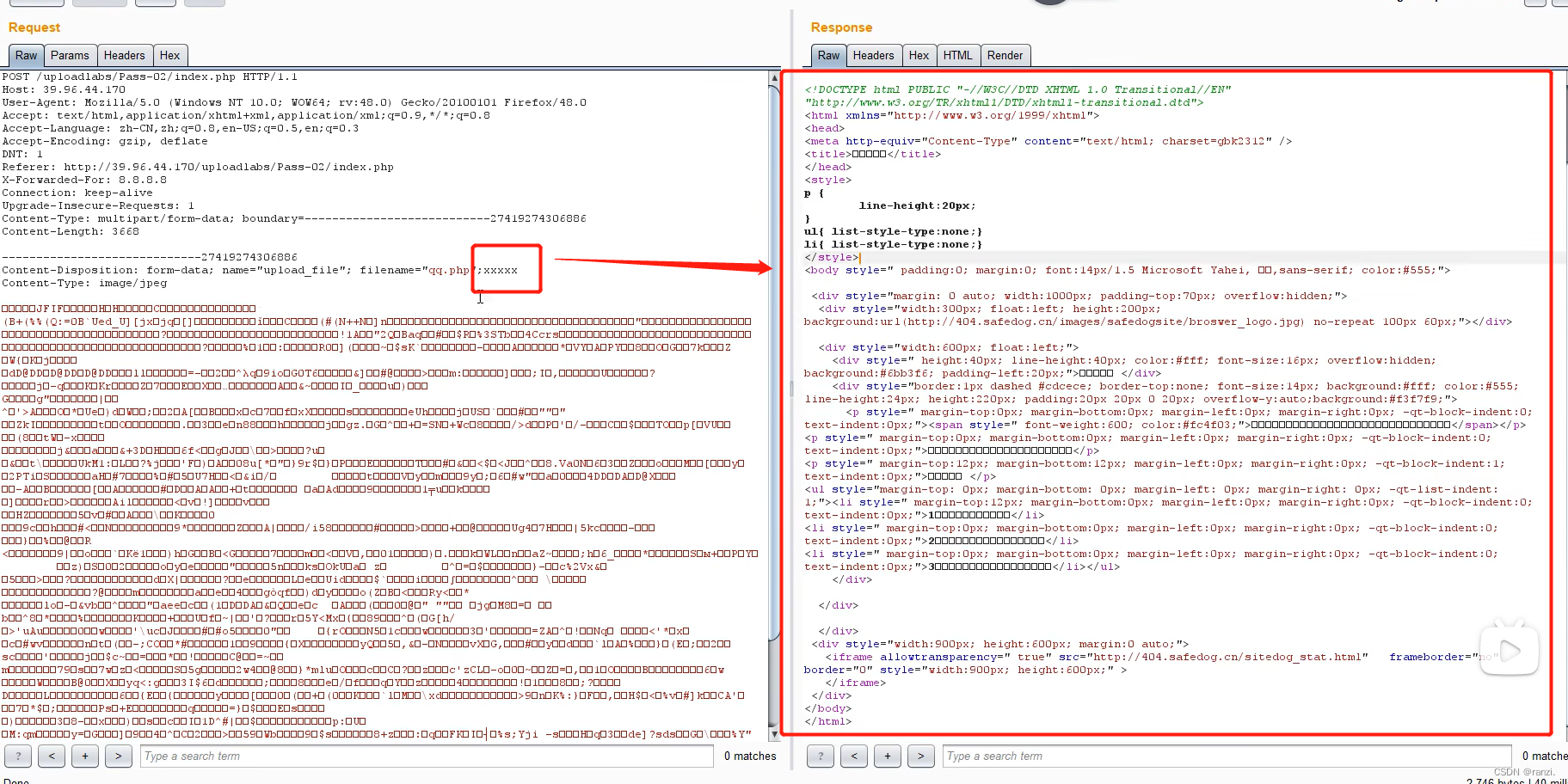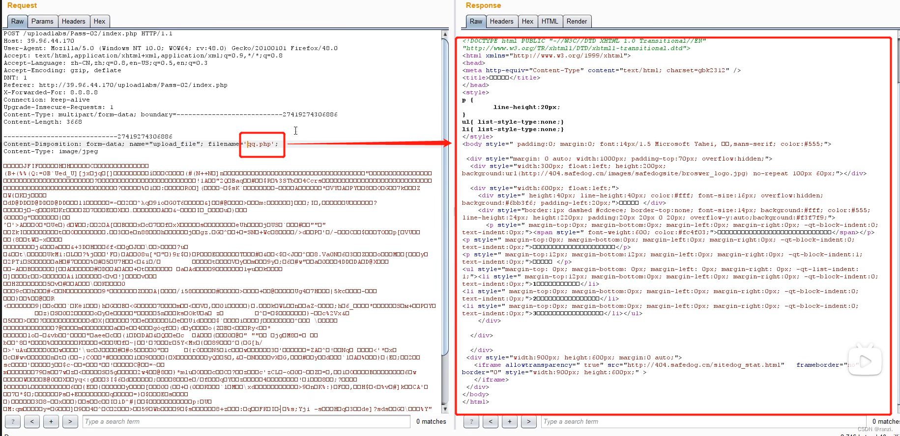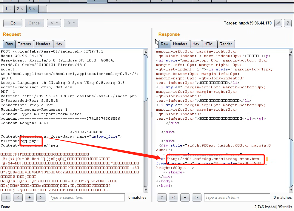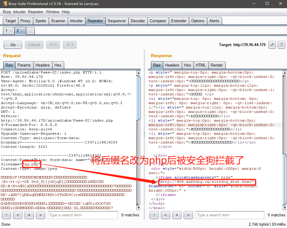 将抓取到的数据包里文件名的后缀改为php后点击上传,发现其被安全狗拦截了,并没有成功上传。