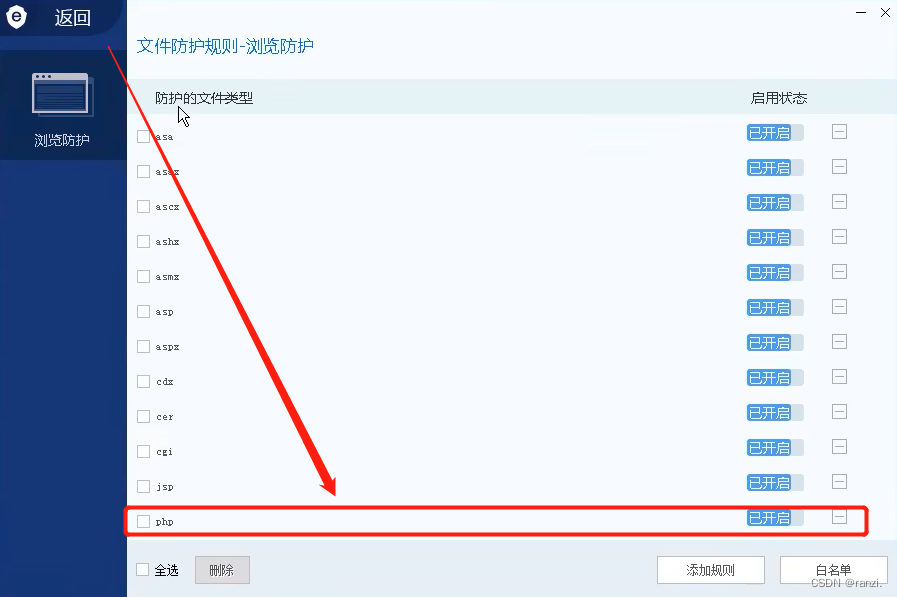 在安全狗里可以看到其存在如下保护,对文后缀名存在限制。