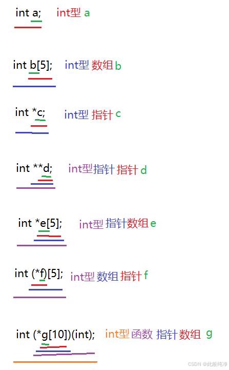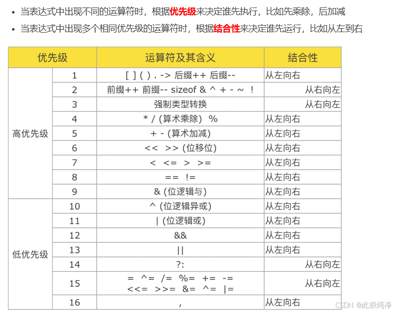 示例代码#include <stdio.h> int main(int argc, char const *argv[]) { // (1)、优先级的说明(比如:加减乘除) int a = 100; int b = 200; int c = 5; int d = 2; int num1 = a-d*b+a/c; // 原来的想法:a-d==》得数*b==>得数+a==》得数/c // 实际的执行:先执行d*b(得数1),再执行a/c(得数2), 再执行a-得数1+得数2 printf("num1 == %d\n", num1); // 应改为: int num2 = ((a-d)*b+a)/c; printf("num2 == %d\n", num2); // (2)、一般为了不产生歧义,以及为了更好的运算,所以你的表达式最好都加上()(因为()是除了[]优先级合结合性都是最高的) int m = 1; int n = 1; int a2 = 1; int b2 = 1; int c2 = 1; int d2 = 1; // 不推荐:if ( m= a2>b2 || n= c2>d2) // 原来的想法: 先求出||的左边的式子:m=a2>b2是否为真,如果不是再求出||右边的式子:n=c2>d2是否为真 // 推荐: if ( (m=a2>b2) || (n=c2>d2) ) { /* 实际的执行: 1、执行a2>b2(求出来:1或0) 2、执行c2>d2(求出来:1或0) 3、1或0(a2>b2) || n == 1或0 4、m=1或0=1或0 // 此处常量不能被赋值 */ } printf("m == %d\n", m); printf("n == %d\n", n); // (3)、普通的优先级合结合性 int n1,n2,n3=100,n4; // =赋值号优先于,号,先执行n3=100的操作 printf("n3 == %d\n", n3); // (4)、辨别复杂类型的方法 // 技巧1:先看变量名(函数名) // 技巧2:再看其优先级,看其和谁先结合,那么其本质就是什么 int p1; // int型p1 int p2[5]; // int型数组p2 int *p3; // int型指针p3 int **p4; // int型指针指针p4(二级指针) int *p5[5]; // int型指针数组p5 int (*p6)[5]; // int型数组指针p6 int (*p7[5])(int); // int型函数指针数组p7 return 0; }