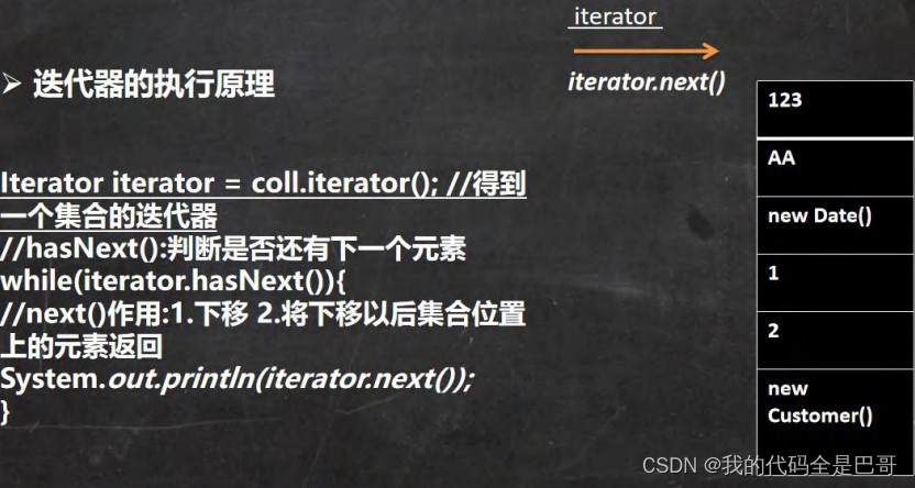 - 所有实现了Collection 接口的集合类都有一个iterator()方法,用以返回一个实现了Iterator接口的对象,即:可以返回一个迭代器