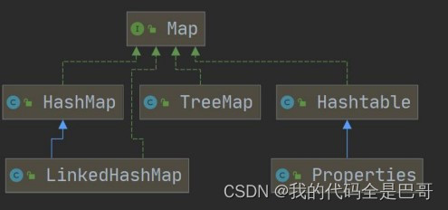 - 实现Map接口的类:HashMap、TreeMap、Hashtable、Properties、LinkedHashMap