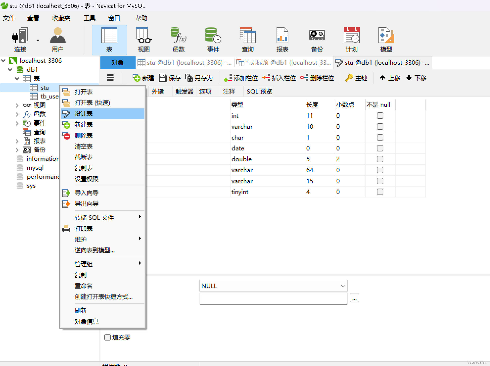 [SQL]insert into stu(id, name) VALUES(1,‘李华‘); [Err] 1366 - Incorrect string value: ‘\xE6\x9D\x8E\xE 右键表——>设计表——>修改编码集为UTF-8。