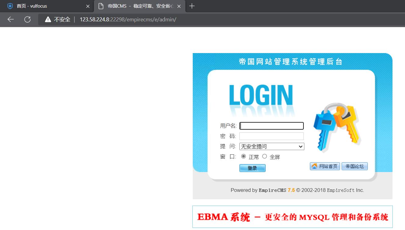 - 进入靶场,登入后台 http://ip/empirecms/e/admin/,账号/密码:admin/123456。