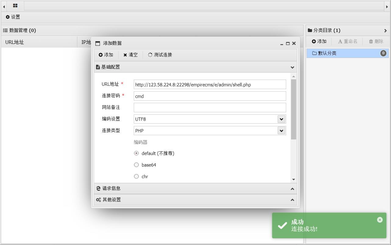 4.webshell管理工具连接http://ip/empirecms/e/admin/shell.php 密码cmd。