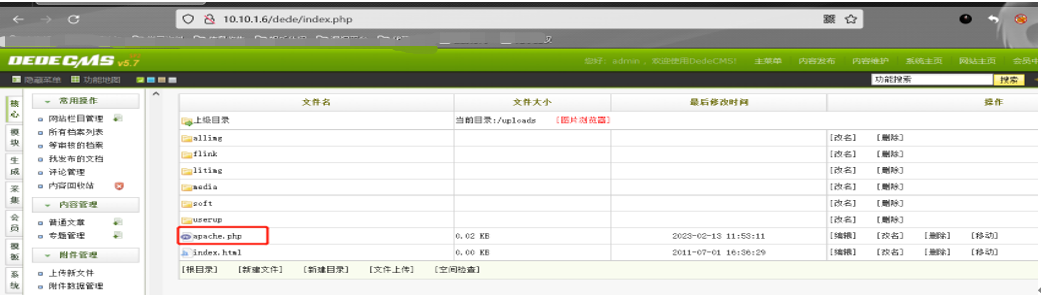 BP抓包对账户密码进行爆破登陆成功 admin admin123 在后台在线文件管理器中新建文件并写入一句话木马