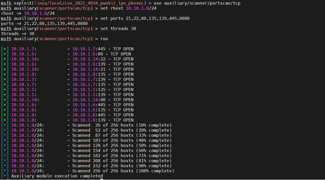 10.使用PortScan模块对内网主机扫描 发现10.10.1.6开放80端口