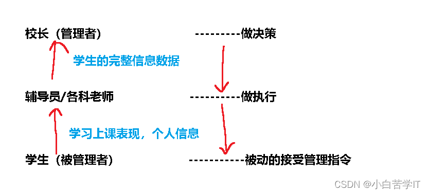 重新回到上面那个例子,假设就校长,辅导员,学生三个层次,其中校长就是管理者,学生是被管理者