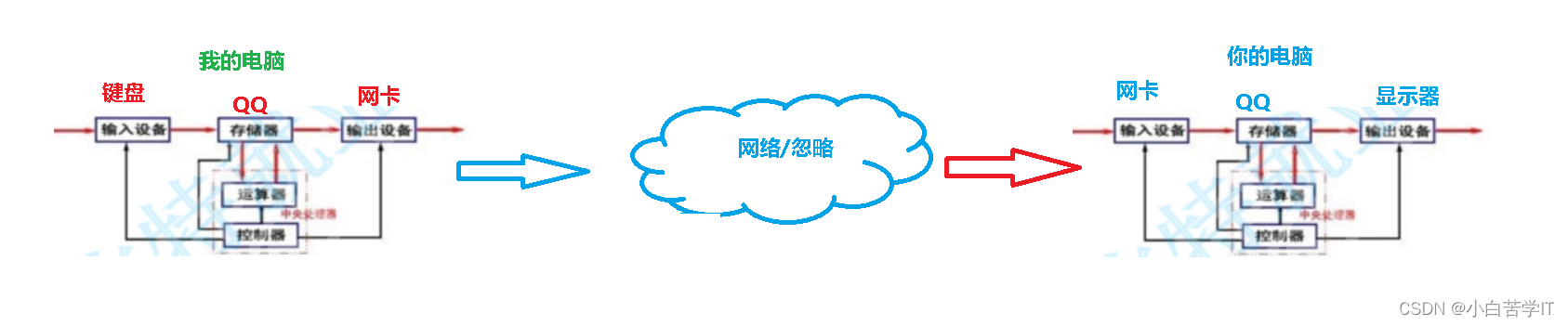首先,在我的电脑上输入设备肯定是键盘,由于我发过去的信息给你的时候我们通常在QQ对话框上看到的不仅仅是“在吗?”这条消息,还有发消息的时间等等内容,学过网络的小伙伴呢肯定都知道,我们是要将这条消息进行打包封装的,但是我们这里就暂且忽略网络,我们的QQ运行的时候就是被加载到了内存的,所以我们在QQ发送的消息也可以理解为从键盘输入加载到了内存,然后经过CPU处理比如打包封装,通过我们的网卡外设进行输出,然后经过网络传输,传输到你的输入设备同样是网卡,然后加载到内存,通过解析,去除封装把消息输出到你的显示器上,那么你就能看到我发过去的“在吗?”这条消息,那么有时候我们发送的消息有时候自己也能看到自己的消息呢是因为,我们的输出设备不止一个,我们通过网卡的输出发送数据的同时,也可以输出一份数据到显示器当中让我们自己能够看到。