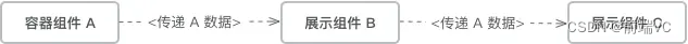 了解了组件职能的划分后,我们看一下组件的层次结构。关于组件的层次,一般页面中不宜嵌套超过3层的组件,因为超过了3层后父子组件的通信就会变得相对困难,不利于项目的开发和维护。3层结构的容器组件与展示组件的数据传递如下: