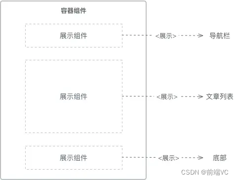 上图我们以博客首页为例,容器组件就是整个首页最外层的父组件,而展示组件就包含导航栏,文章列表,底部等子组件,代码层面如下:
