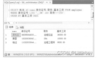 例:在employee表中列出满足身份证号的左起第三位是0、除了CTO以外的,所有员工的姓名、身份证号、职务和基本工资,其中姓名字段显示为name,查询结果按照基本工资的由高到低排序。