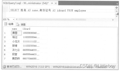 例:查询employee表中“姓名” 和“身份证号” 两列数据,查询结果“姓名”列名称显示为“name”;“身份证号”列名称显示为“idcard”